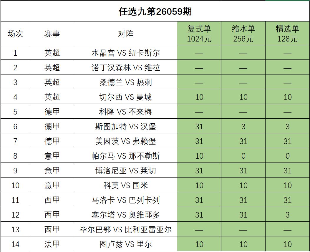 特别提醒:14场提供大中小3种金额方案,大复式为大底方案,资金可能比较大;缩水单为万元以下中等金额方案;精选单为千元以下小额精选方案。老铁们可根据自己的经济实力自由选择。